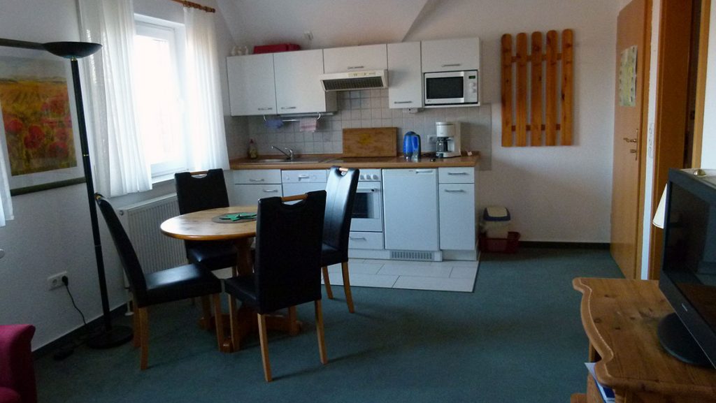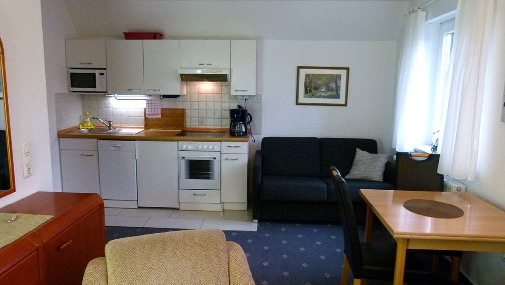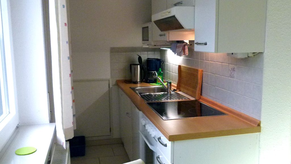 Auststattung der Küchenzeile: Jede Wohnung ist mit Geschirrspüler, Glaskeramik Kochfeld, Umluftbackofen mit Grill, Mikrowelle, dazu Kühlschrank mit Gefrierfach, ausgestattet.